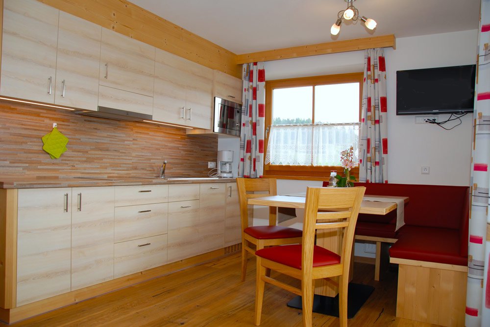 Mit vier Schlafgelegenheiten im Schlafzimmer und zwei auf der Schlafcouch im Wohnbereich können auf den 38 Quadratmetern unserer etwas größeren Ferienwohnung Sas dla Crusc bis zu sechs Personen einen Sommer- oder Winterurlaub verbringen. Auch hier gibt es einen schönen Balkon mit Aussicht. Das Bad ist wie auch in den anderen Ferienwohnungen mit einem Fenster ausgestattet und verfügt über Dusche, Waschbecken, WC und Bidet.